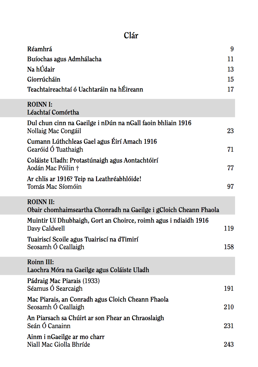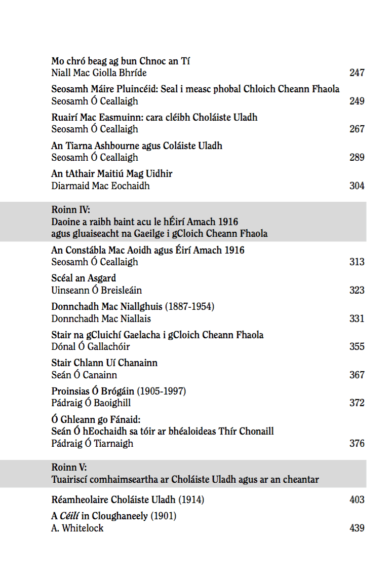 Cnuasach tríocha is a cúig alt atá sa leabhar seo a cheiliúrann tréimhse thar a bheith spéisiúil i stair na hÉireann agus i stair pharóiste Chloich Cheann Fhaola: tréimhse na hAthbheochana, blianta tosaigh Choláiste Uladh, laochra an Aiséirí – Pádraig Mac Piarais, Seosamh Máire Pluincéid agus Ruairí Mac Easmuinn, agus daoine iomráiteacha eile a raibh baint acu le Coláiste Uladh ar bhealaí éagsúla. Tá na léachtaí a tugadh i nGort an Choirce thar dheireadh seachtaine Chomóradh an Chéid 1916 foilsithe anseo fosta chomh maith le hathfhoilsiú ar ailt, tuairiscí agus cuntais as nuachtáin srl. an ama sin a fuarthas in: An Claidheamh Soluis, Ardfheiseanna Chonradh na Gaeilge, An Cumann le Béaloideas Éireann, The New Ireland Review, The Sinn Féin Rebellion Handbook 1917, The Derry People and Donegal News, srl.