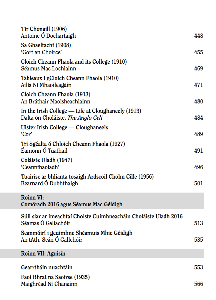 Ag deireadh an leabhair tá dhá alt ag cur síos ar na himeachtaí éagsúla a d’eagraigh Coiste Comórtha Choláiste Uladh do 2016 chomh maith le seanmóirí tochtmhara a thug an tAth. Seán Ó Gallchóir, S.P. Gort an Choirce, faoi Shéamus Mac Géidigh, laoch mór na Gaeilge a fuair bás le linn an chomóraidh.